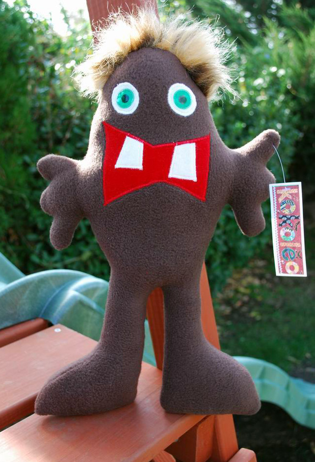 Fuzzerd loves it when you run your fingers through his fuzzy hair. Go on, you know you want to. He is composed of polyester stuffing, fleece, felt teeth and mouth, faux fur, and securely attached plastic green eyes. He measures 16 inches tall and has a 10 inch arm span.