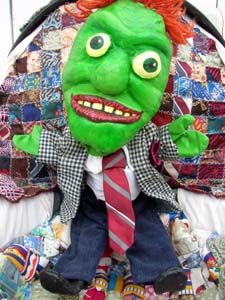 and yarn hair. He stands in front of a man's dress shirt (tag