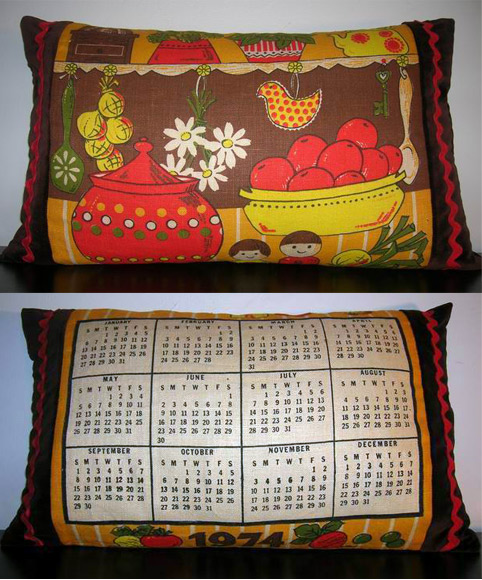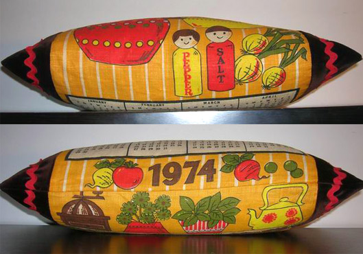 This kitchy kitchen scene has it all - onions, tomatoes, garlic, a little retro pot, plants, a tea kettle, spoons, daisies, a decorative birdie, and my favorite, little Fisher-Price- looking salt and pepper people. The back has a calendar from 1974 on it - the year I was born! The sides are composed of vintage brown velvet accented with red ric-rac. The pillowform is composed of 100% sterilized feathers. It measures 19.5 inches wide by 11 inches tall.