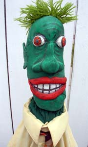Herbert guards my vacuum cleaner and inadvertantly frightens unsuspecting passersby. He is composed of pantyhose painted with acrylic, yarn hair,fabric hands, a boy's dress shirt and tie.