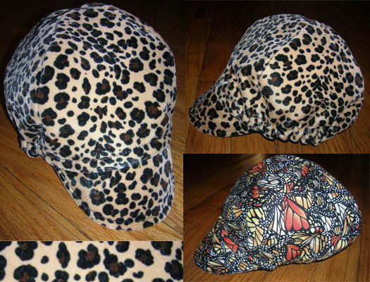 Two hats in one! This reversible hat has a velvety leopard print on one side and a butterfly print fabric on the other, It is machine washable. It stretches from 18-21 inches and would best fit a child 1-3 years old.