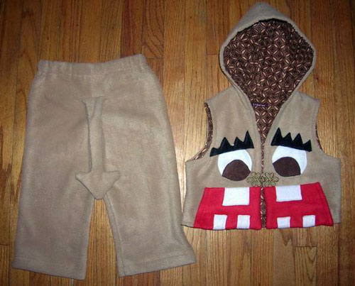 This super-soft camel print fleece vest sports a monster face on the front and a mouth that doubles as pockets. It's lined with vintage brown cotton material and closes with a decorative fastener at the nose. The pants have a fun tail in the back and measure 20 inches at the waist and 13 inches along the inseam.