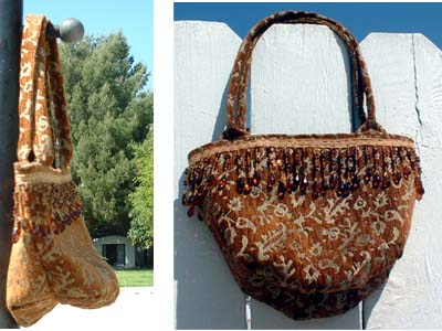 beaded accents hand-stitched to bag, zipper closure, inside zipper