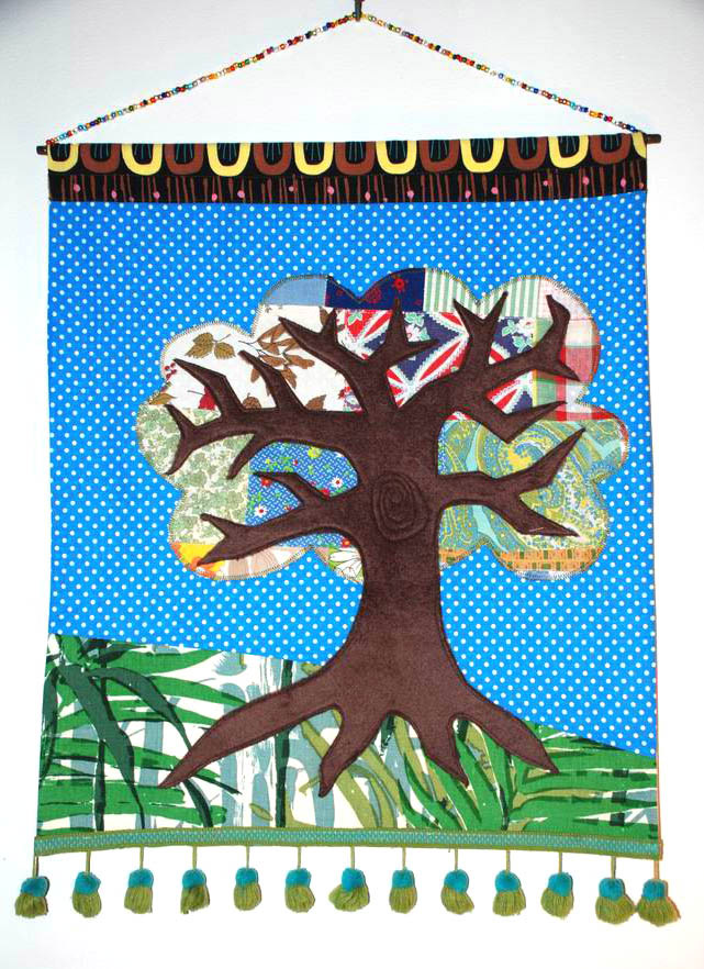 Composed of a vintage quilt top and fleece trunk stitched atop vintage fabrics and embellished with vintage trim. Hangs with beaded wire attached to a wooden dowel rod. Signed, dated, and numbered on the back.