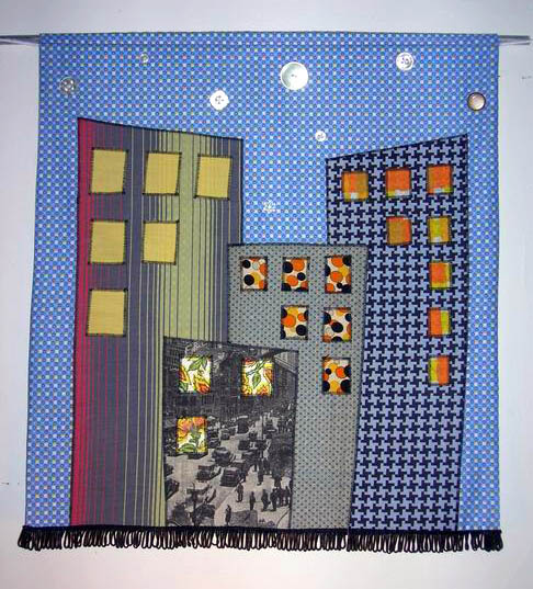 Composed nine different fabrics and embellished with vintage trim and buttons. Hangs with beaded wire attached to a silver painted wooden dowel rod. Signed, dated, and numbered on the back.