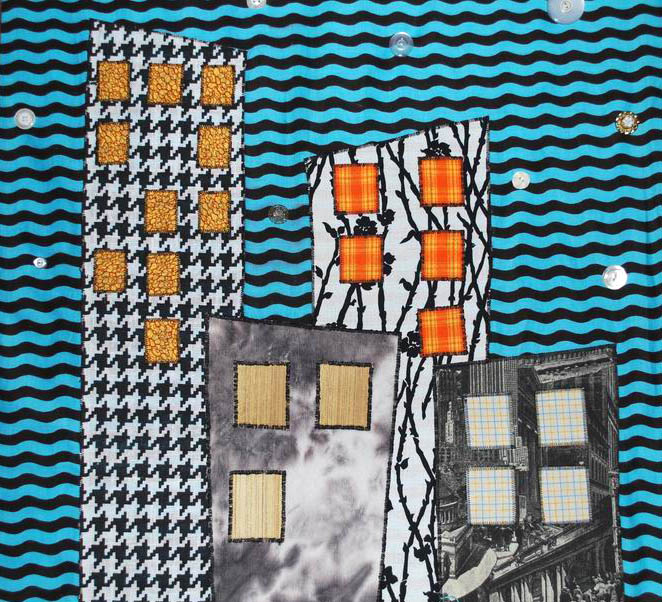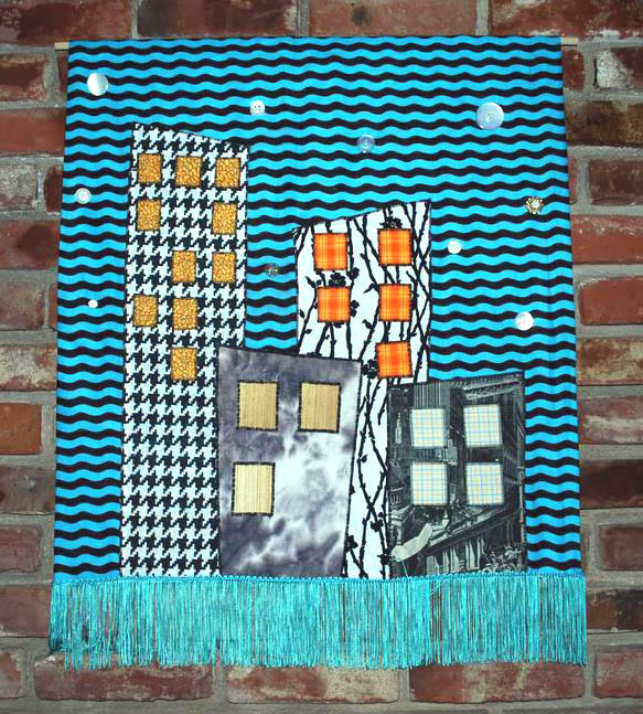 Composed nine different fabrics and embellished with vintage trim and buttons. Hangs with beaded wire attached to a silver painted wooden dowel rod. Signed, dated, and numbered on the back.